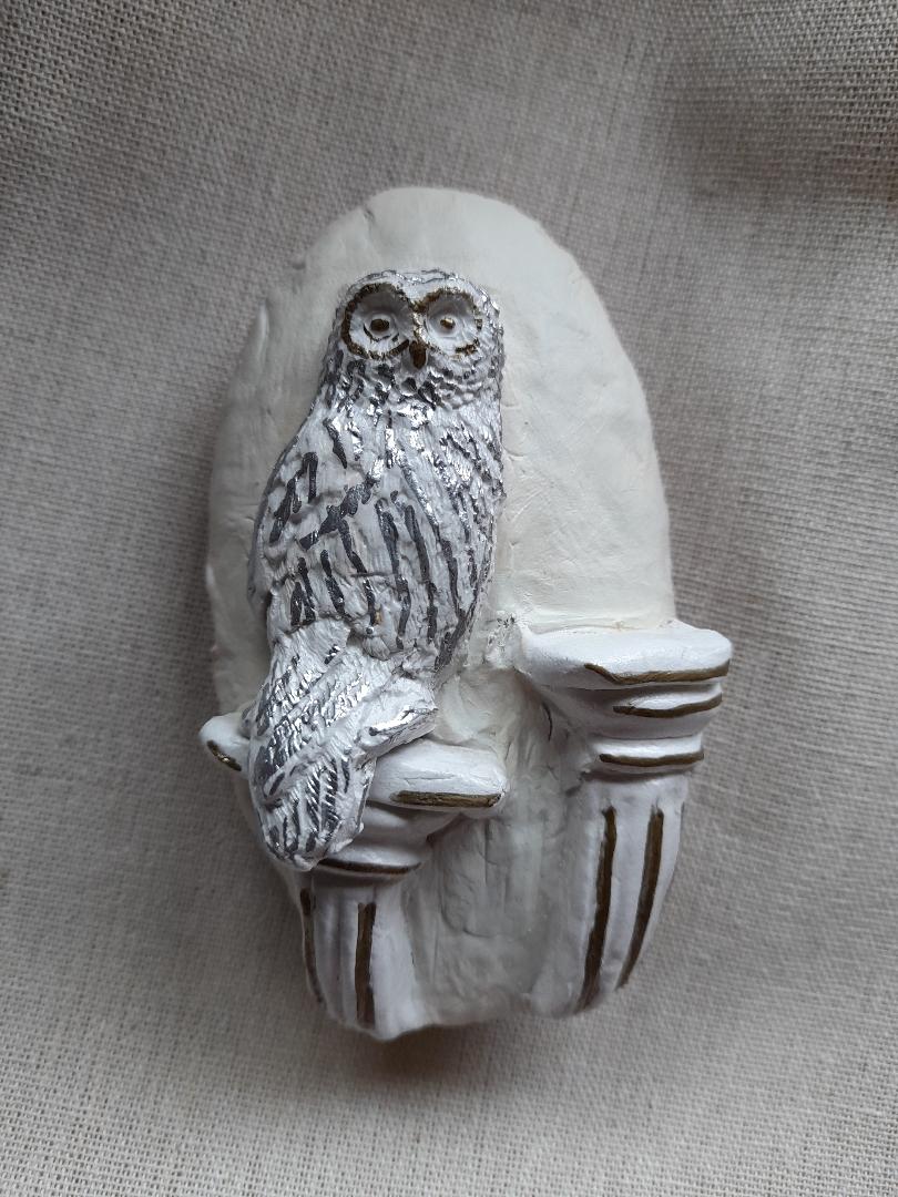 A styrofoam pebble, handmade coated with clay, that portrays the bird of wisdom standing on an ancient pillar ready to present you with a flair of antiquity passing its virtues right to its new owner!